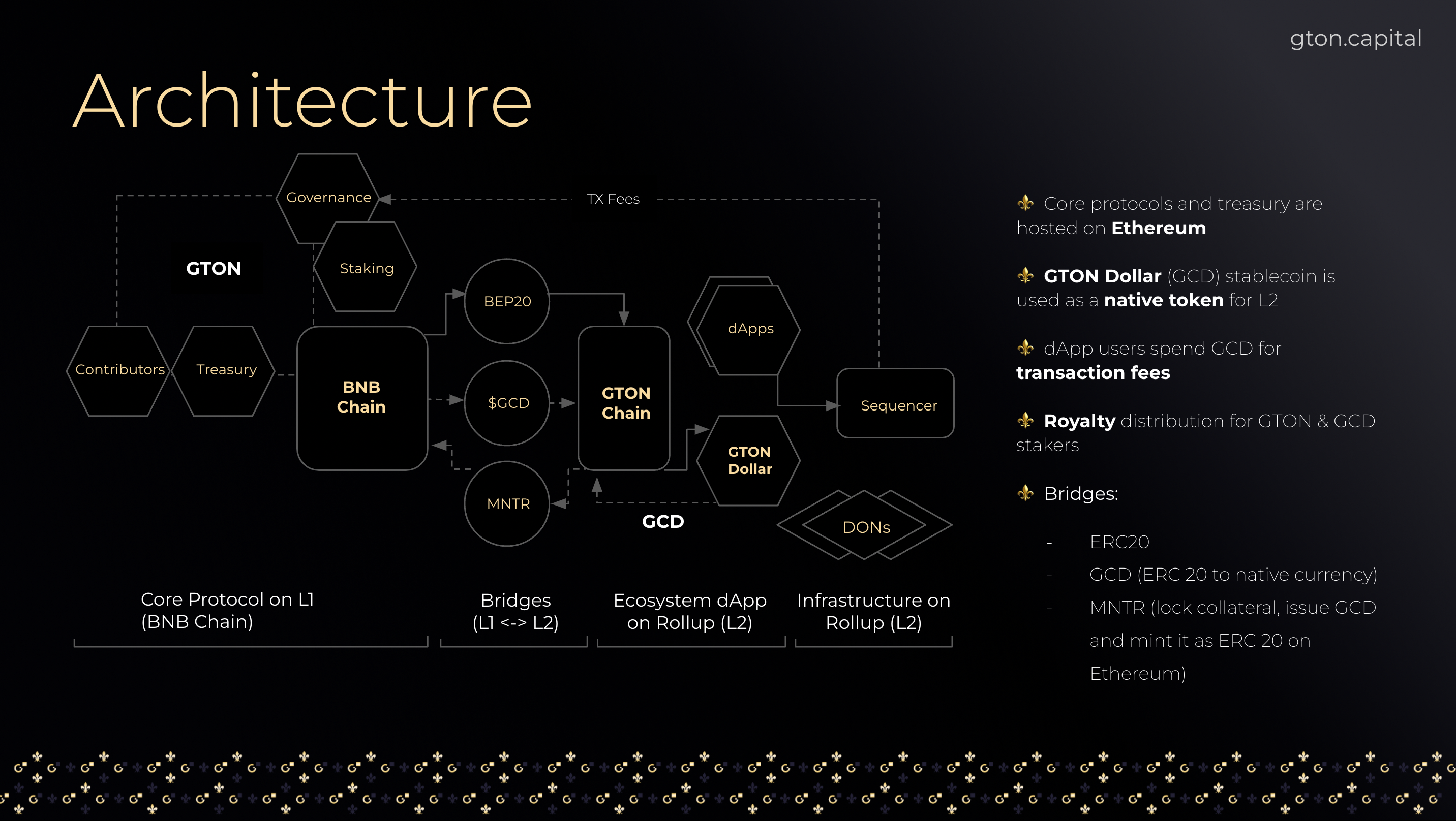 The three key components of the architecture are represented by smart contracts on the BNB Chain network and a bridge system for BEP20 tokens and for the native rollup token GCD (GTON Dollar). The minting of the native stablecoin token takes place only on the GTON Network, and through a bridge, the stablecoin is made available on the BNB Chain as a BEP20 token.&#x20;