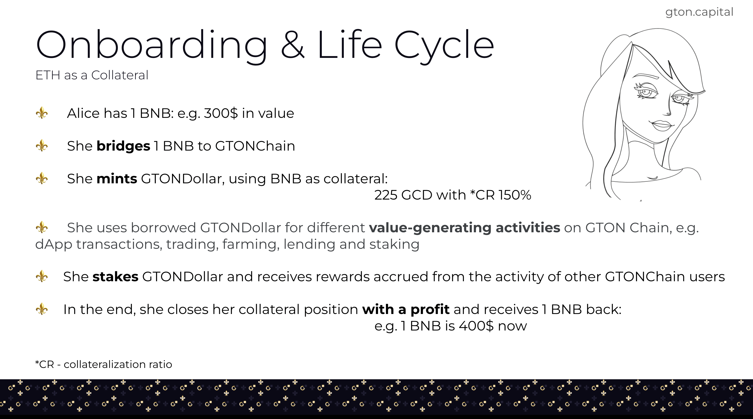 I. Alice believes in the potential of the protocol and wants to use applications on the GTON network. However, she only owns BNB on Binance and does not want to sell it. Therefore, Alice bridges BNB to the GTON network and uses it as collateral to issue some GCD stablecoins. Since the stablecoin is the native token of the protocol, Alice can immediately transfer any tokens and use a variety of dApps: exchanges, lending protocols, NFT marketplace or farming services. When Alice does not need GCD to pay for transactions, she can use it for stablecoin staking to generate profit that is redistributed by the other users of the GTON network. After some time, Alice notices that her BNB has increased significantly in value. However, Alice only needs the amount of GCD she borrowed in the beginning to close the debt position. As a result, Alice ends up in a "triple win" situation: she kept her BNB, generated value from applications, and also received profit from commissions from protocol users.