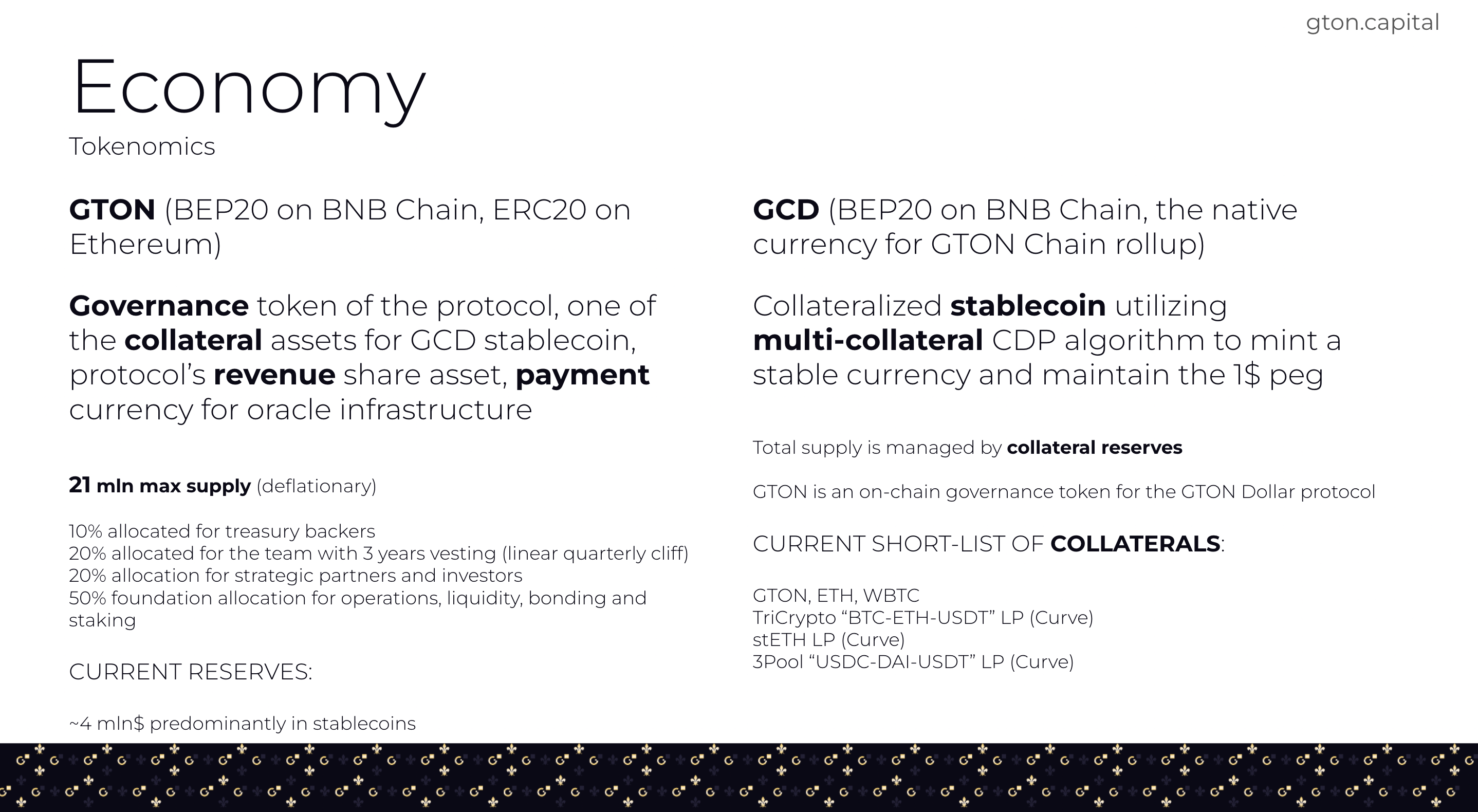 The GTON protocol has a dual token model represented by the governance and utility token GTON and the collateralized stablecoin GCD: